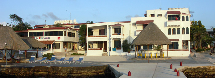 We left the house at 10:45pm to catch a red-eye flight from San Francisco to Houston. From there we had a short flight to Cozumel, an island off the east coast of the Yucatan Peninsula, just south of Cancun. We arrived at Scuba Club Cozumel just after noon, about 15 minutes after Rick's parents had arrived. Our rooms weren't ready yet so we headed to the restaurant for lunch (and marguerites!). We looked around the resort, it was very nice; quiet and right on the water.