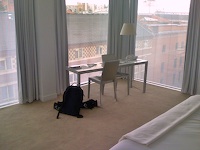 Up early, packed, breakfast, cab to airport. Two and a half hours to London. Took the Heathrow Express to Paddington (though it took an hour due to track work), then a cab to the hotel. Some sort of ceremony going on at Buckingham Palace. Checked into the Saint Martins Lane Hotel. After two bad rooms (first had no A/C, second was very smoky), they ended up upgrading us to a fantastic corner suite on the 5th floor. The London Eye was visible out the window.
